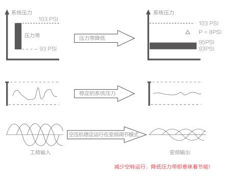 IntelliFlow智能流量控制器可以對(duì)系統(tǒng)壓力帶進(jìn)行精確的控制。通過(guò)對(duì)壓縮空氣系統(tǒng)的評(píng)估,可以知道可能達(dá)到的最低的操作氣壓。 利用這個(gè)原理,加上采取正確的存儲(chǔ)措施,以及采用IntelliFlow的供應(yīng)恒壓壓縮空氣的獨(dú)特技術(shù),對(duì)用氣端壓力的總體需求就會(huì)降 低。用氣端壓力的需求降低后,由于泄漏所消耗的壓縮空氣就減少,未經(jīng)很好壓力調(diào)節(jié)的使用量也能夠降低,由此就能幫您節(jié)省大量 的能源和金錢(qián)。
